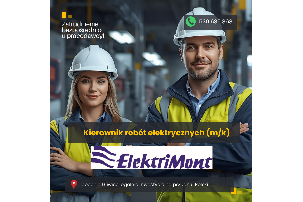 ELEKTRIMONT to krakowska firma z ponad 35-letnim doświadczeniem w branży elektrycznej, która z powodzeniem realizuje kompleksowe instalacje elektryczne i teletechniczne w obiektach przemysłowych, komercyjnych oraz użyteczności publicznej. Dzięki ugruntowanej pozycji na rynku oraz wysokim standardom pracy, przedsiębiorstwo cieszy się zaufaniem zarówno klientów, jak i partnerów biznesowych. Obecnie, w związku z dynamicznym rozwojem, ELEKTRIMONT poszukuje kandydatów na stanowisko: