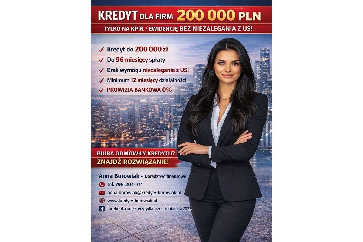 KREDYT DLA FIRM DO 200 000 PLN TYLKO NA KPiR lub EWIDENCJĘ, BEZ NIEZALEGANIA Z US!